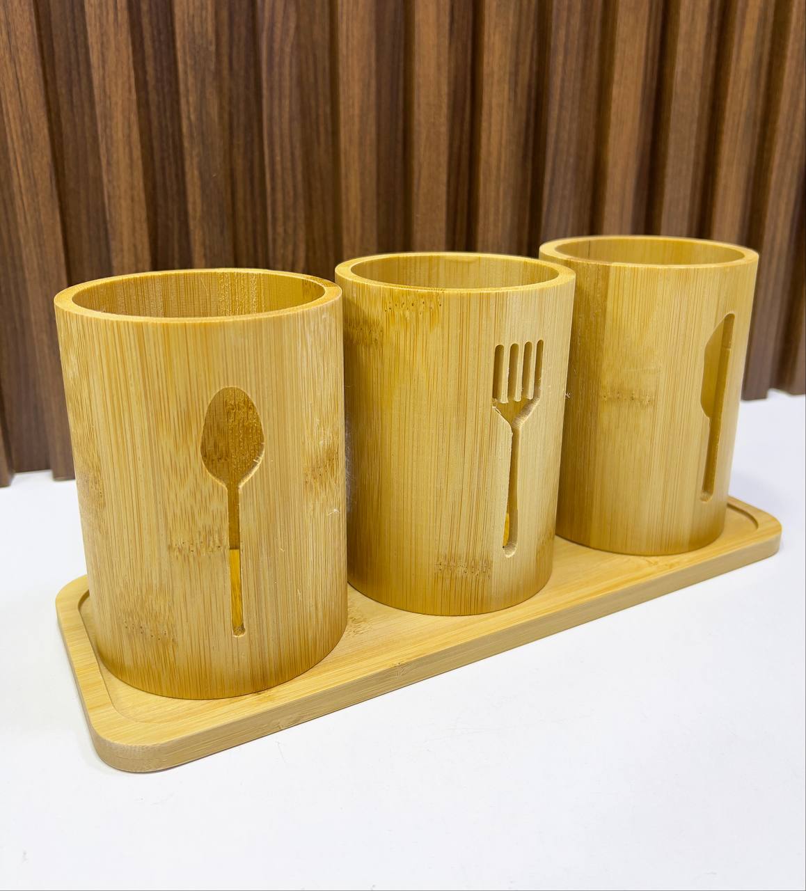 Composé de 3 pots de rangement en bambou + 1 plateau assorti, ce set astucieux vous permet de trier, organiser et présenter vos ustensiles de manière chic et ordonnée : couteaux, fourchettes, cuillères, pailles réutilisables, baguettes... tout trouve enfin sa place.