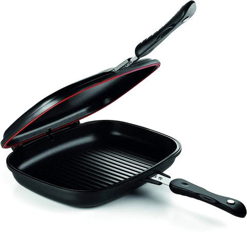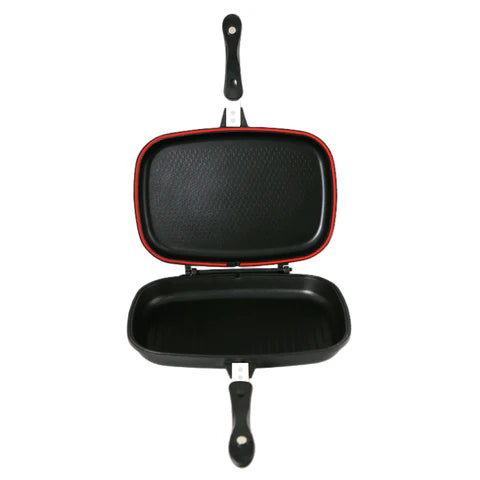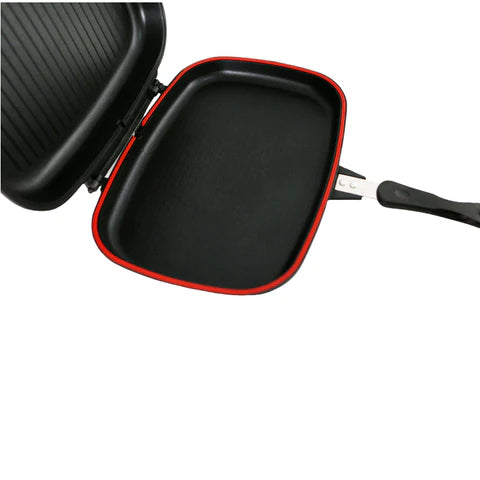 La double poêle rectangulaire en aluminium antiadhésive est un ustensile de cuisine polyvalent conçu pour griller une variété d'aliments avec facilité et efficacité.